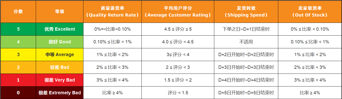海外仓(FBJ)卖家的货物由仓库发出,发货速度【Shipping Speed】,卖家取消率【Cancellation Rate (Out-of-Stock)】均默认5分。需要注意质量退货率(quality return rate)、产品评分(average customer rating)。