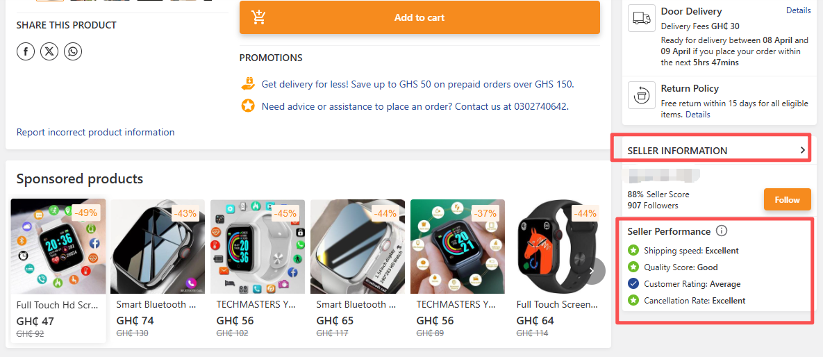 以下图为例,假设卖家中心的显示的店铺分数为4.4,除以总分(5分),则前台展示为88% Seller Score( 4.4/5=88%),即卖家店铺拿到了总分的百分比为88: