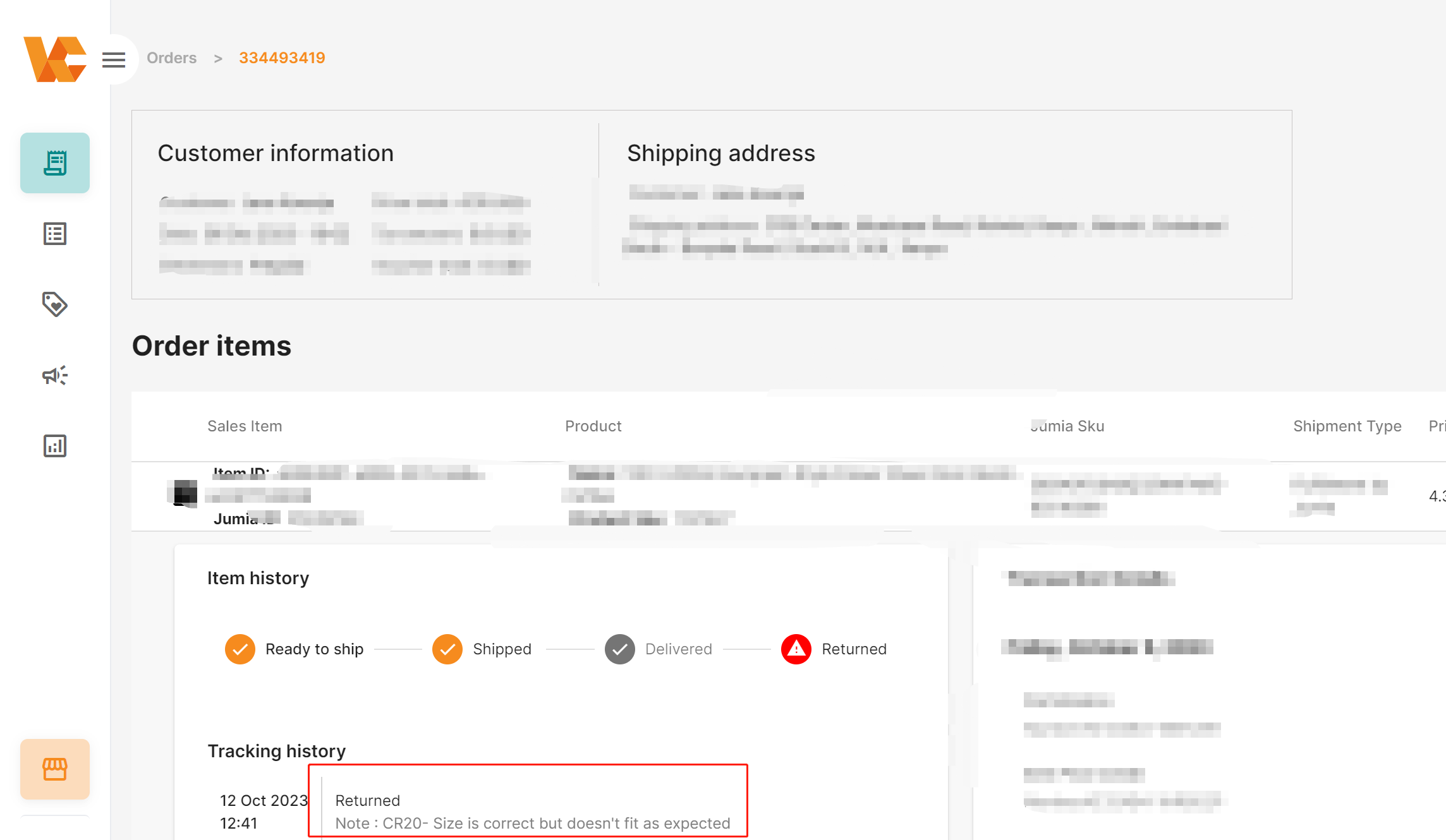 Order > Returned > 点击 “Order number” > 点击 “Order items” details > 点击 ”+“