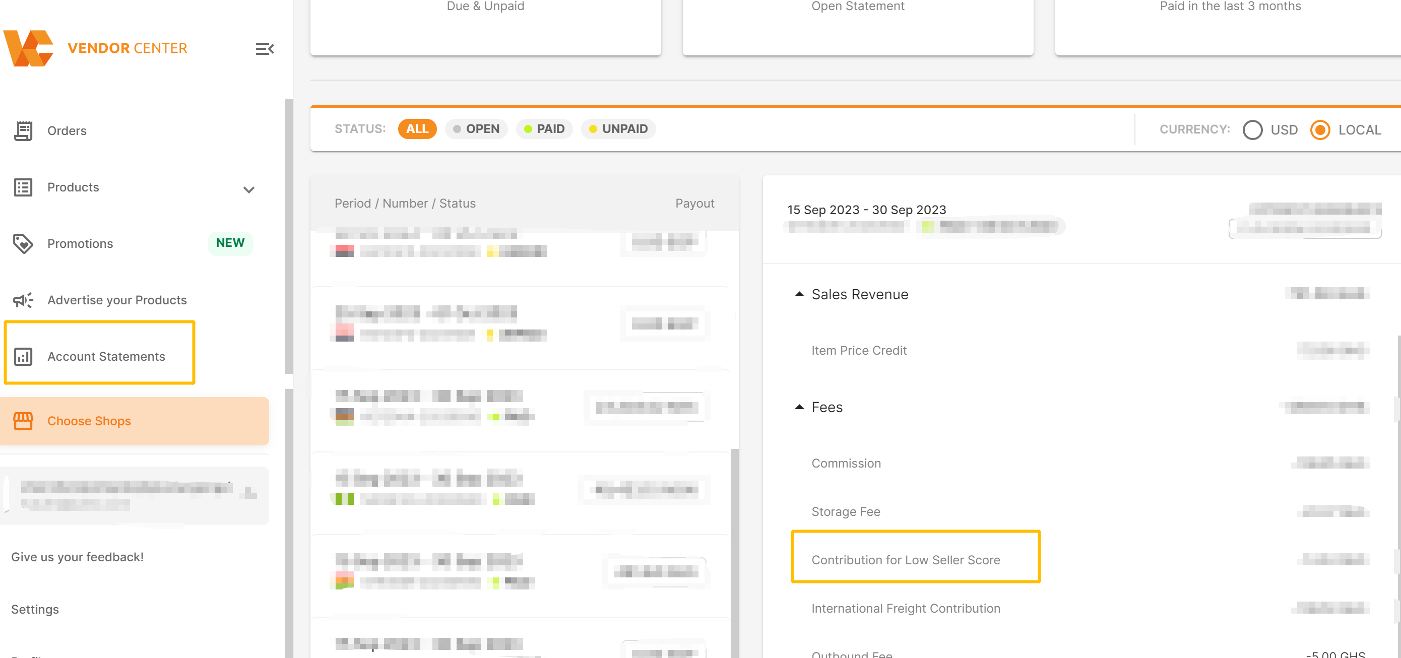 额外收取的佣金在账单中显示为“Contribution for low seller score:Venter Center -> Account Statements -> Fees,如下图所示: