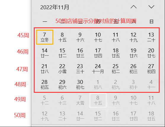 注:“过去4周”是指以店铺分数更新的当周看“负2周至负5周”为一个完整的计算周期,如下图所示,第50周后台显示的店铺分数为第48周、第47周、第46周、第45周,总计四周期间的分数 (简称Last 28 days,缩写为L28D)。