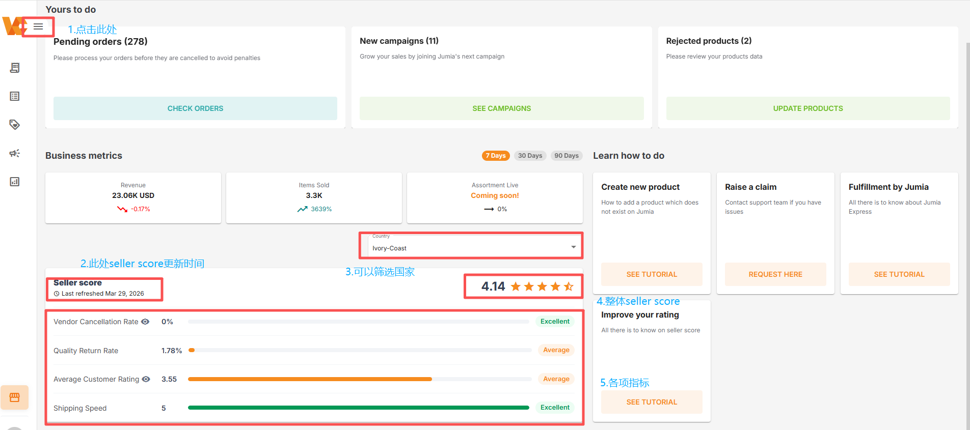 | NG | Jumia | 2 | 60 | 1个产品因卖家无法发货而取消,计入卖家取消率;1个因买家自行取消,不计入。 | 1/60*100%=1.66% | 1.66%对应得分为3分 |