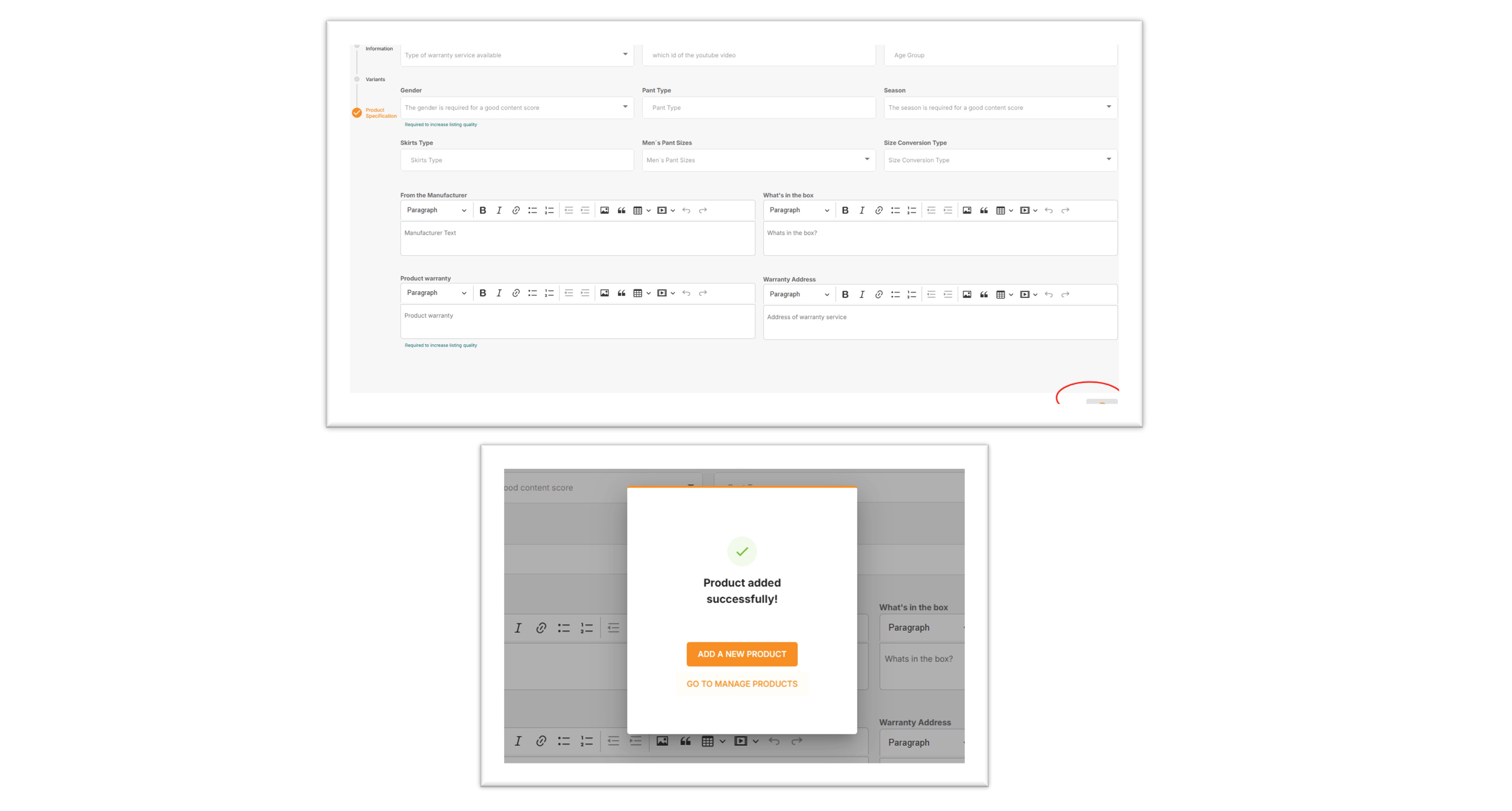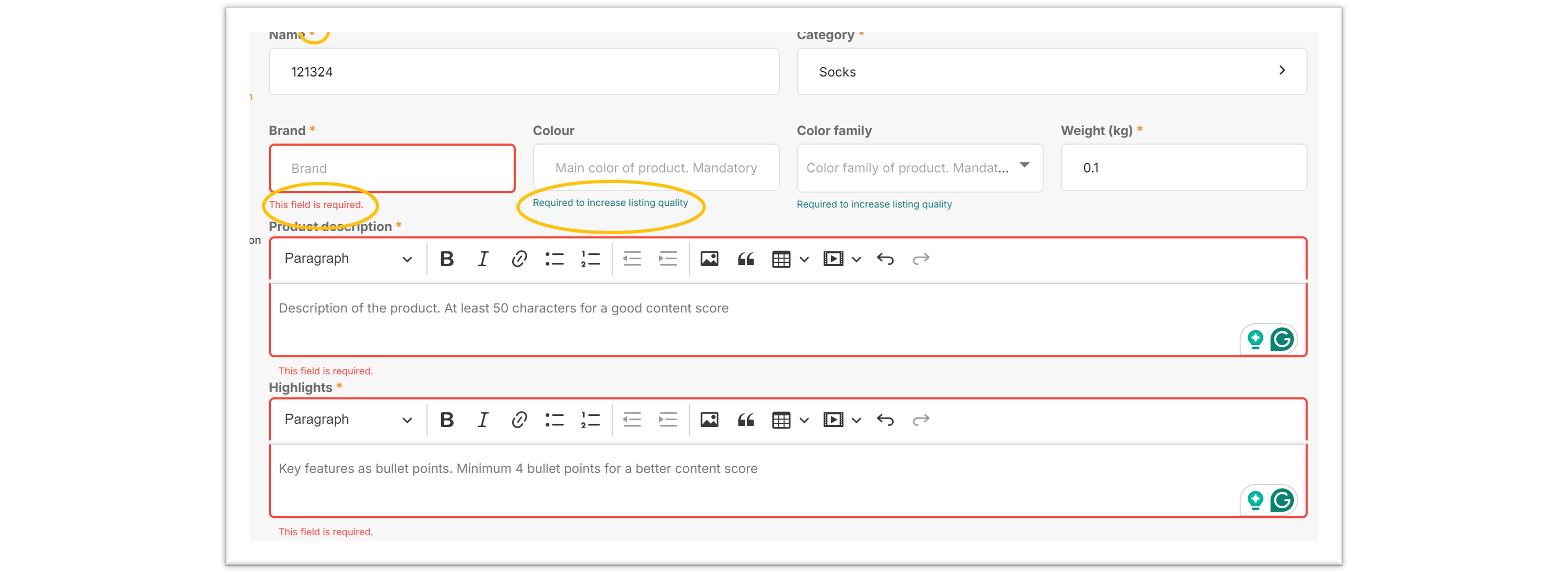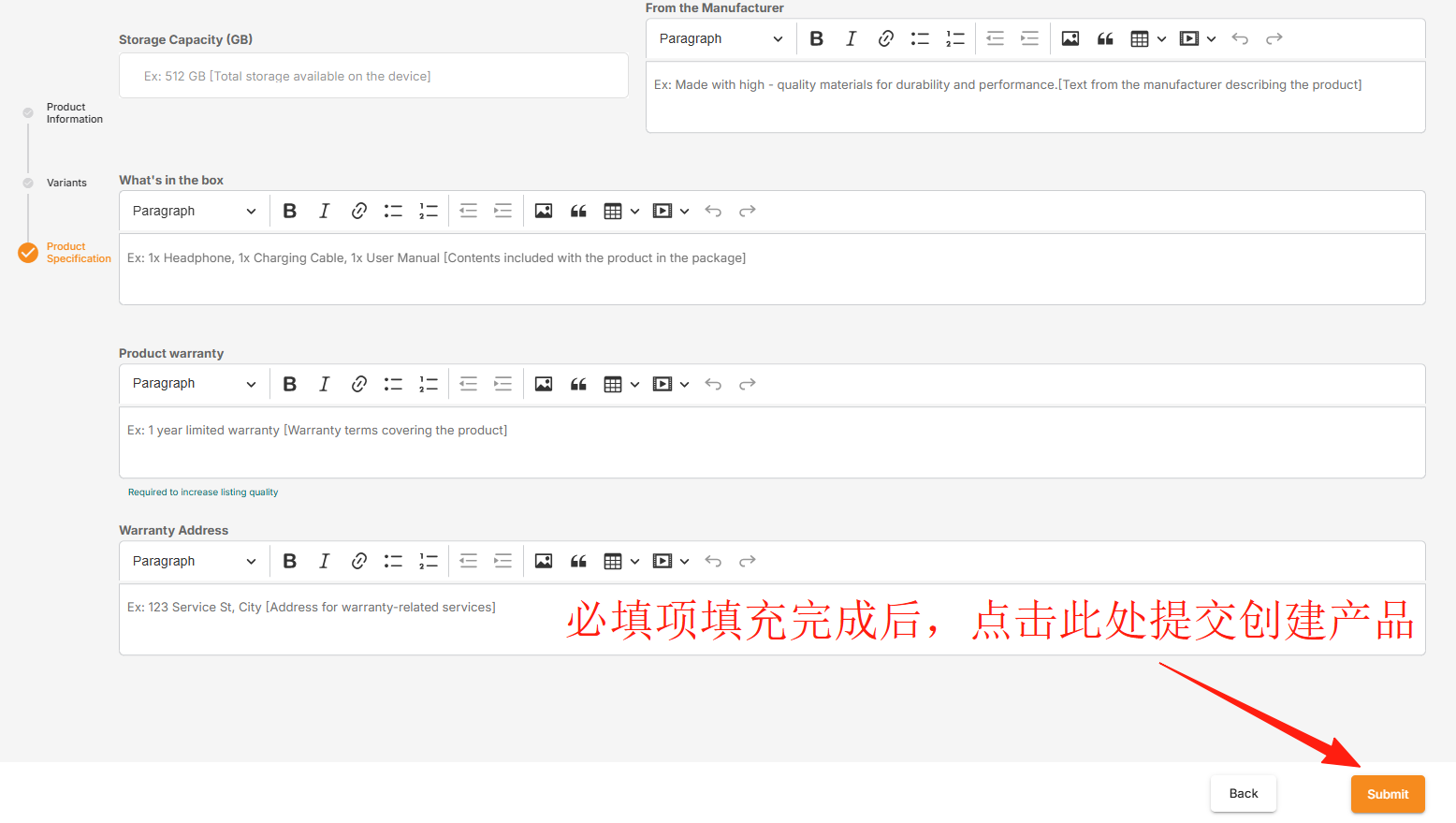 提醒:带*的方框则表示为必填项,没有填写将无法创建产品。红色字体则表示对应方框未填写或填写的内容不符合标准。绿色字体部分则表示填写后会提升产品的分数。