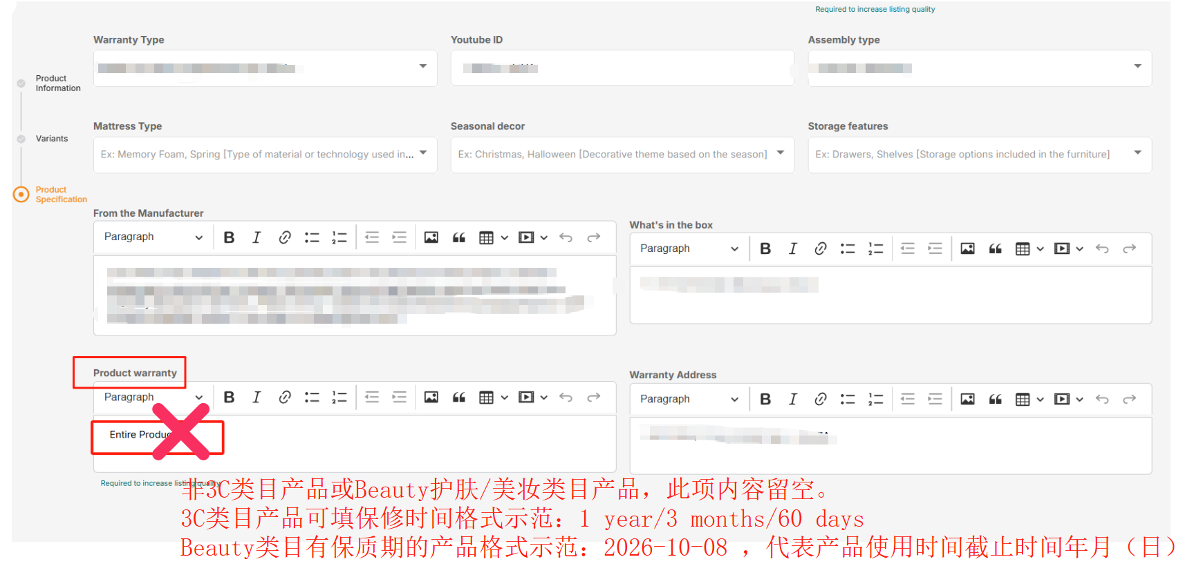尤其注意”Product warranty“此项内容的填写要求,如下图所示。