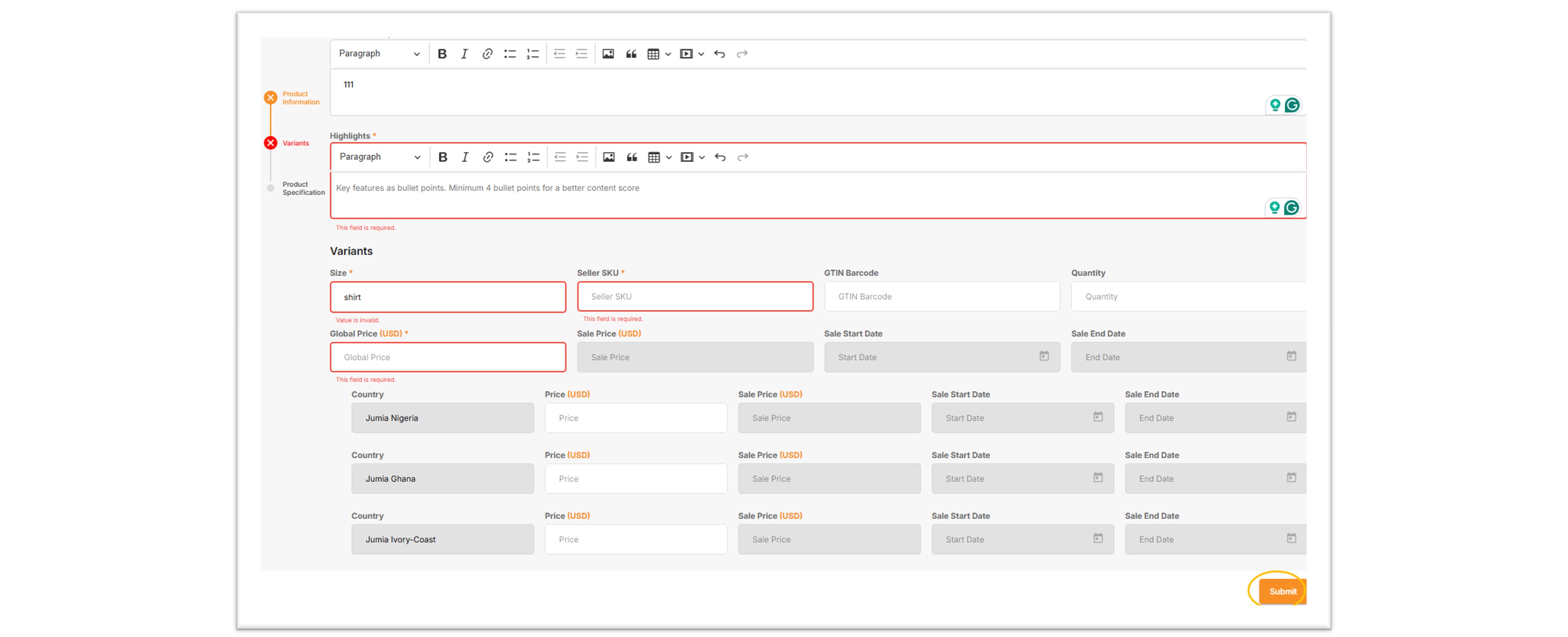 1.Jumia不允许颜色以及形状、容量作为变体;仅允许Fashion 类目产品以尺码做变体。如果作为变体创建时会被系统拒绝上架(QC rejected)。
