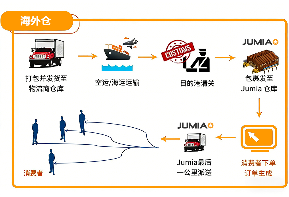 海外仓(Fulfillment by Jumia)是指由卖家自行选择物流供应商,安排批量发货至Jumia境外当地仓库。Jumia当地仓库提供仓储及代发货服务,实现本地销售及高速尾程派送的物流形式。海外仓卖家在完成海外仓备货后,无需做任何动作,一切出单步骤(包括打单,贴标,出库,派送等)均由Jumia当地海外仓团队执行。