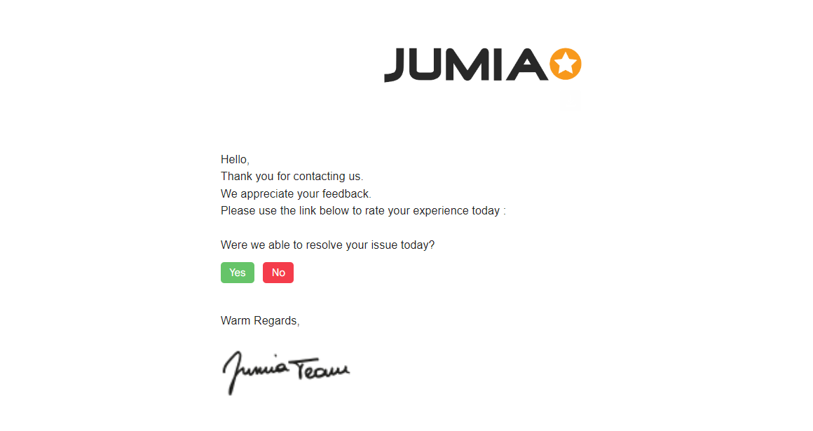 当Jumia卖家支持团队处理完您的申诉,您会收到一个调查问卷的邮件,如下所示。