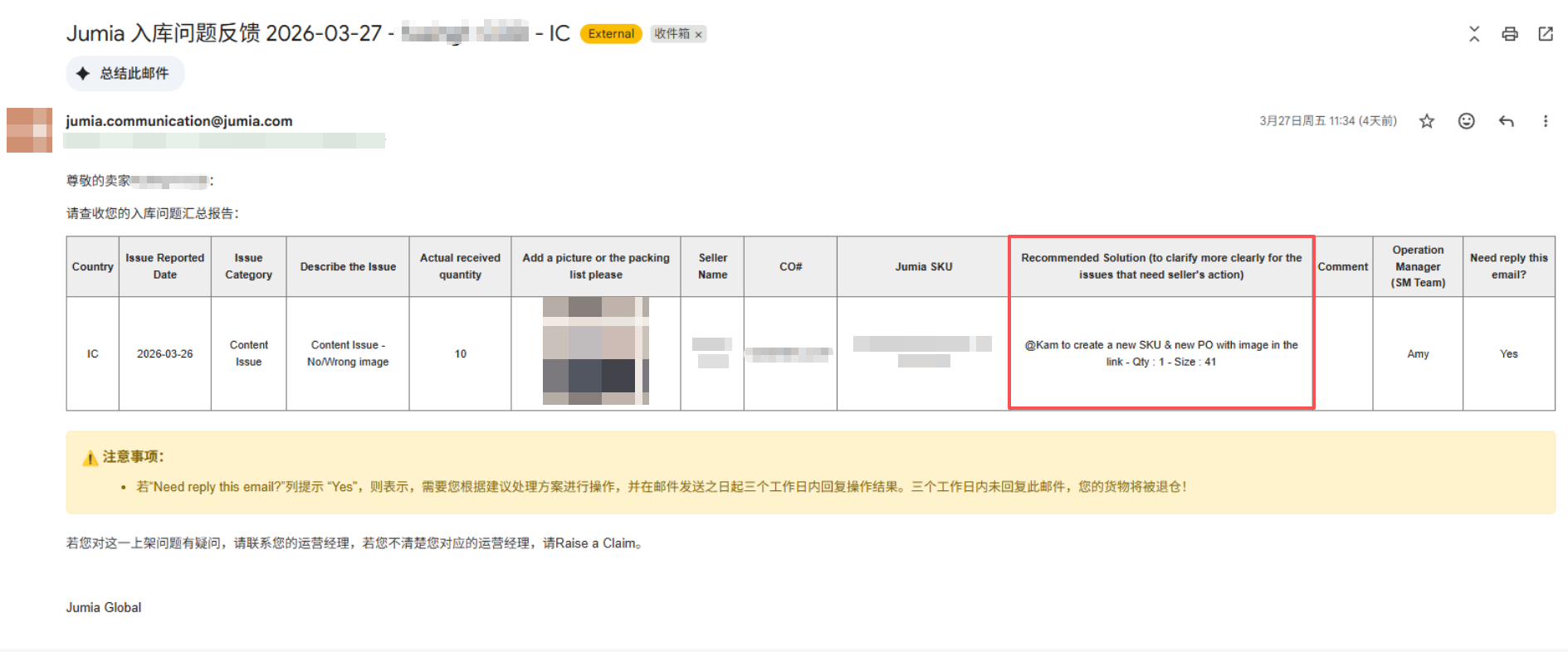 - 若“Need reply this email?”列提示“Yes",则表示,需要您根据建议处理方案进行操作,并在邮件发送之日起三个工作日内回复操作结果。三个工作日内未回复此邮件,您的货物将被退仓!