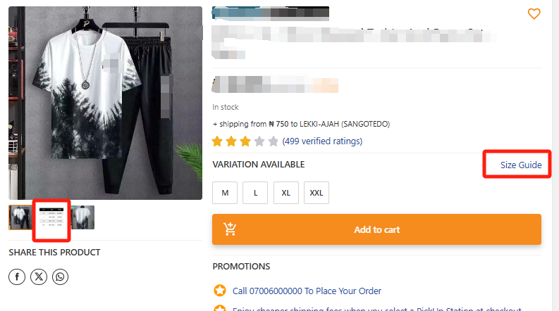 对于时尚类商品(例如成人和儿童服装、鞋履等),商品详情页将显示 JUMIA 推荐的尺码指南Size Guide。如果您的实际商品尺码与 JUMIA 推荐的尺码指南不符,请在商品图片列表中上传您正确的尺码表(建议将其放在第二张图片的位置,避免仅放在商品描述中)。这样,顾客在浏览商品时可以第一时间直观地比较尺码信息,从而减少因尺码不符而导致的退换货。