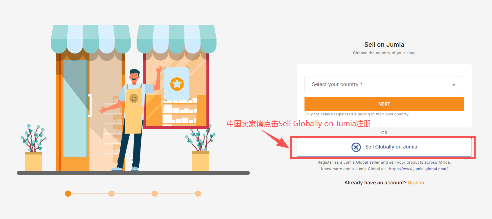 中国卖家需要选择“Sell Globally on Jumia”,即”中国卖家入驻通道“,以创建卖家账户。